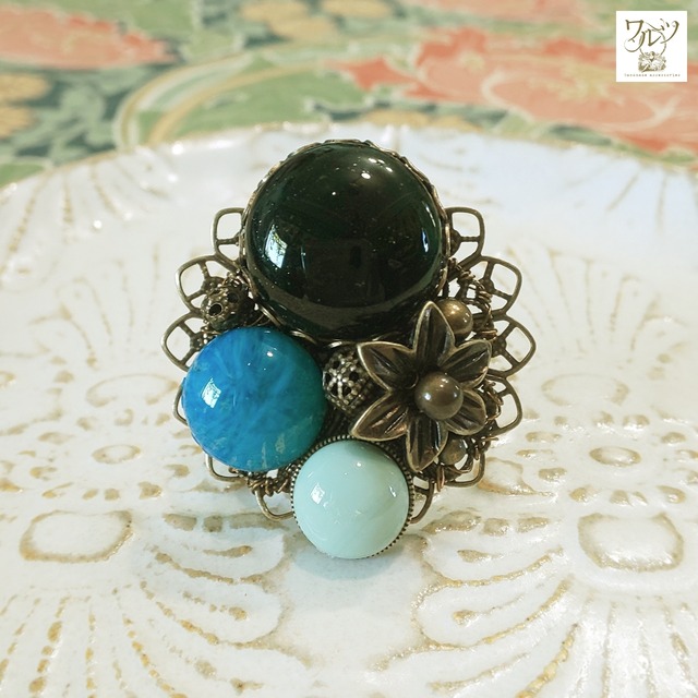 ※サイズ情報をご確認ください ※画像の品をお届けします 「都城シラスオパール」というガラスを使用したアクセサリー。 シラスオパールの大サイズはラメの入った濃い緑、中サイズは水色のマーブル、 小サイズはミルキーグリーンです。 水色は透かして見ると黄緑やオレンジ色が覗きます。 ※グリーンは画像よりも落ち着いた抹茶寄りの色です 全体的な金具の色は金古美(ブラウン)で、指輪パーツは黒です。 12号~のフリーサイズの指輪です。 サイズ調整の合わせ目がガラスの裏にあり、着用すると指から少し浮いた感じになります。 透かしパーツにワイヤーなどで丁寧に取り付けています。 金具の色は金古美(ブラウン)ですが、ベースの金属が真鍮か銅かで色合いが少し違います。 ※凹凸や接着部分をカバーするよう裏も丁寧に処理していますが繊細な金属パーツです。お取り扱いにはご注意ください。また怪我にご注意ください シラスオパール一覧: https://waltz48.thebase.in/categories/5165253 指輪一覧: https://waltz48.thebase.in/categories/4789456 【都城シラスオパール】1986年に宮崎県都城市で開発された、火山灰土壌(シラス)が主原料のオパール風のガラス。 不透明・マーブル模様・ドラゴンズブレスやサフィレット風など様々な色合いがあります。 手作りのガラスです。形が不揃いだったり、気泡や内包物・小傷や曇りなどが見られる場合があります。予めご了承くださいませ。 【サイズ】ガラス部分の直径 約35~38mm、一番大きいガラスの直径 約18mm、 リングサイズ 12号~フリー 【素材】金属、都城シラスオパール(ガラス) ※天然石やカラフルなパーツはアプリや画面の状況で鮮やかな色に見えることがありますが、実物はそれより落ち着いた色です ※天然石など自然素材は色や形、大きさが1粒ずつ違います。また傷や内包物などがございます。 ヴィンテージパーツは傷・サビ・色ムラ・補修跡など見られることがあります。予めご了承くださいませ ※14KGF・サージカルステンレス・チタン素材のピアスは金属アレルギーの方も着けやすいと言われていますが、 個人差、また体調によって合わない場合もあります。予めご了承くださいませ(他の細かいパーツはメッキです) ※無料ギフト包装は発送梱包(厚さ3cm以内)に収まるサイズでご用意できます。ご希望の際はどの品をギフト包装するかご指定下さい ☆お買い上げ前に必ずご一読ください https://waltz48.thebase.in/items/22725194