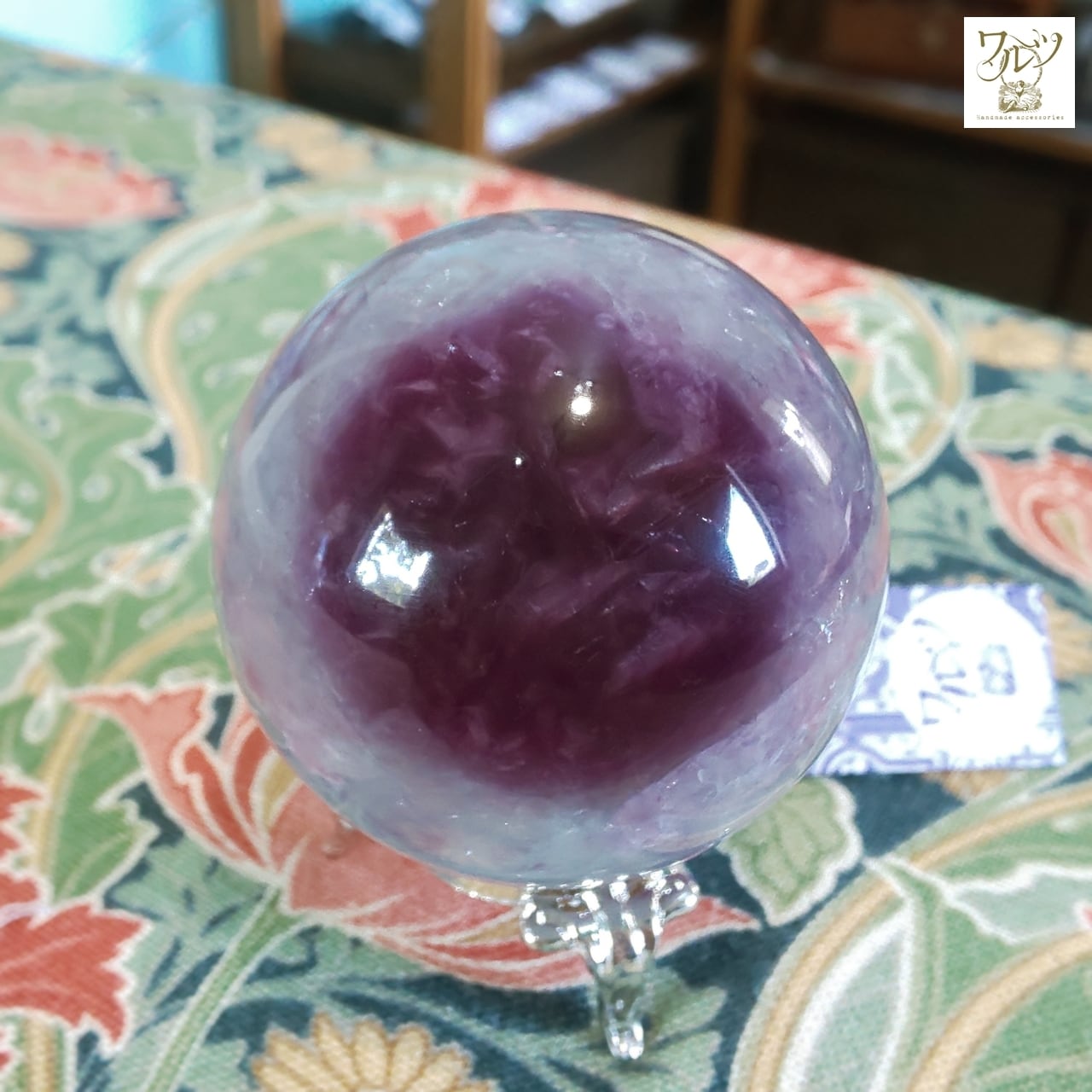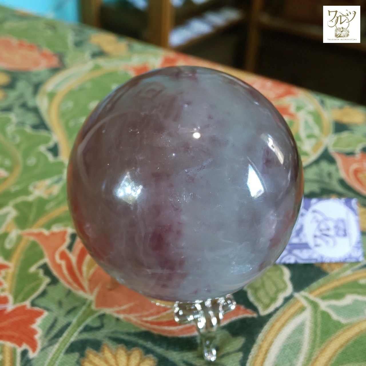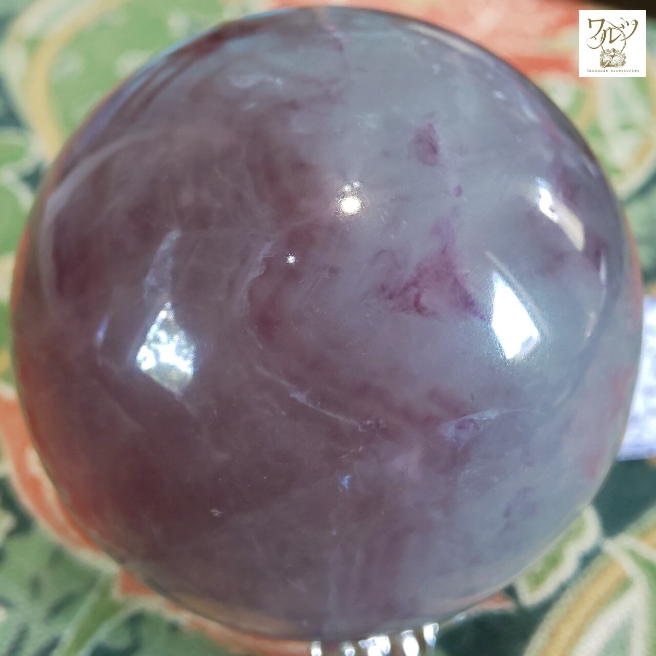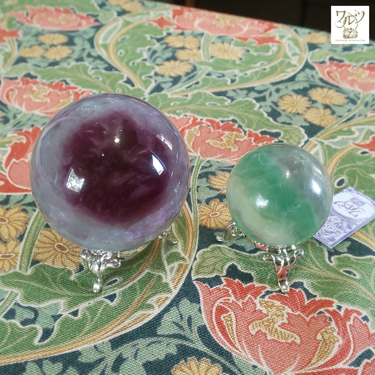 赤紫と灰色っぽい水色のバイカラー(2色)のフローライト丸玉。