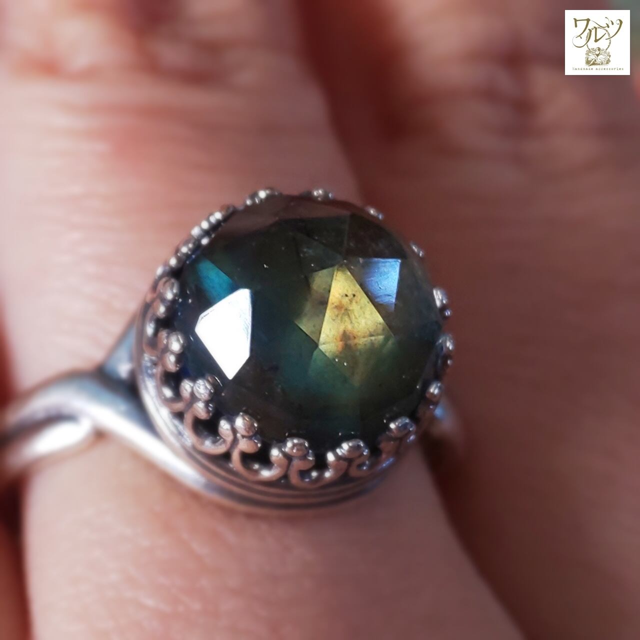【フリーサイズ】クラウン リング・ラブラドライト×クリスタル #10【17号前後】