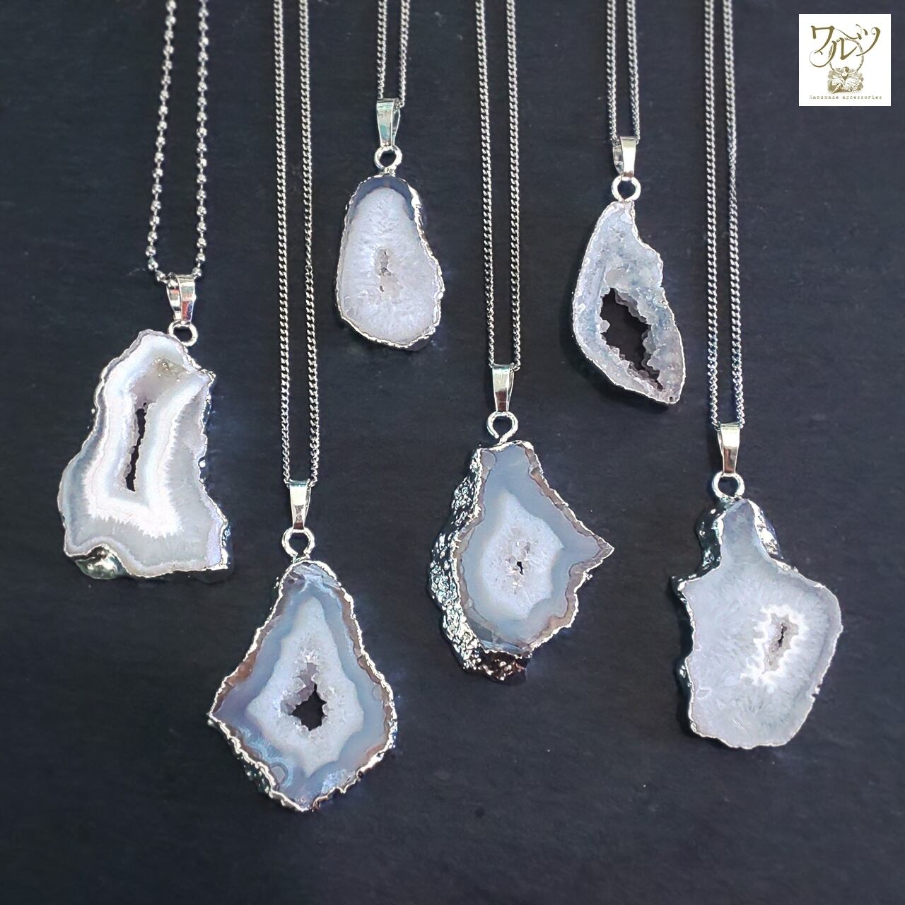 スライスされたアゲート(めのう)のジオード(晶洞)のネックレス。