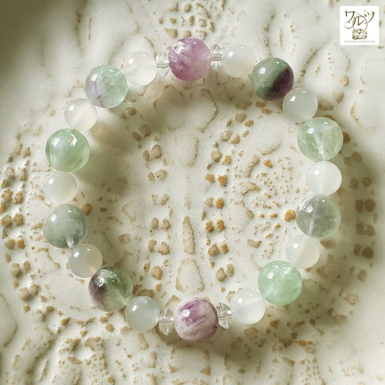 【サイズ】フローライト 約10mm×10粒、ムーンストーン 約8mm×10粒、水晶ソロバン 4粒、ブレスレット内周 約16cm