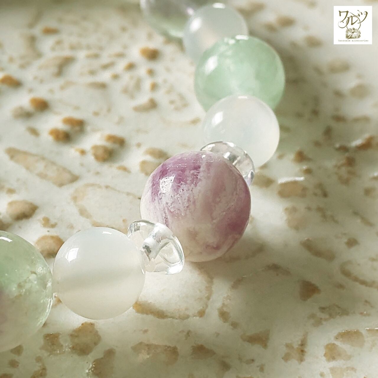 【素材】フローライト(中国産)、ムーンストーン(タンザニア産)、水晶(ブラジル)、オペロンゴム