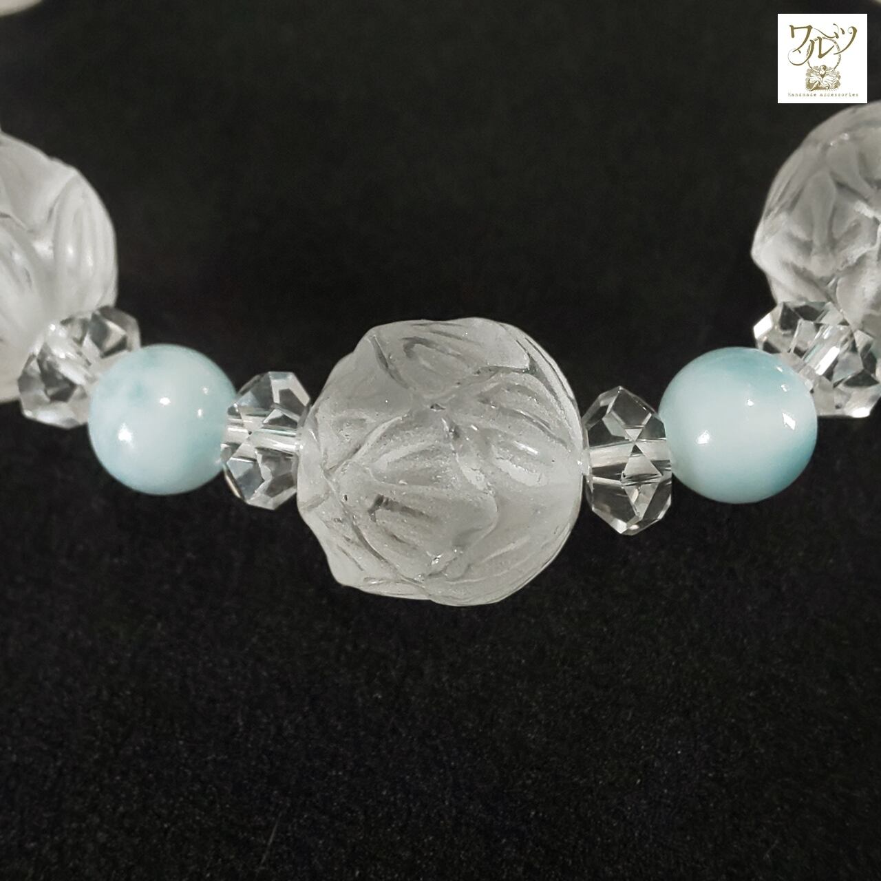 水紋のような模様が美しいラリマーと蓮の花の形に彫られた水晶を合わせたブレスレット。
