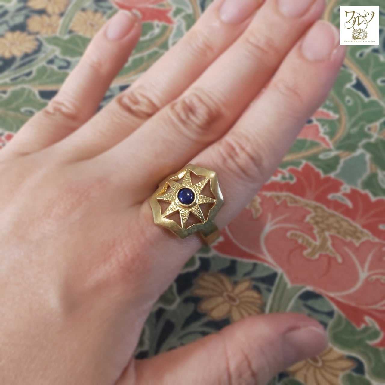 魔法が使えそうな個性的なデザインのアクセサリー。真ん中の石は落ち着いた紫色のラピスラズリです。
