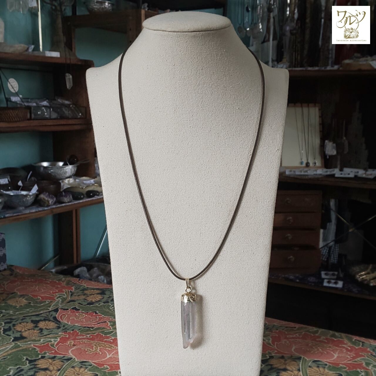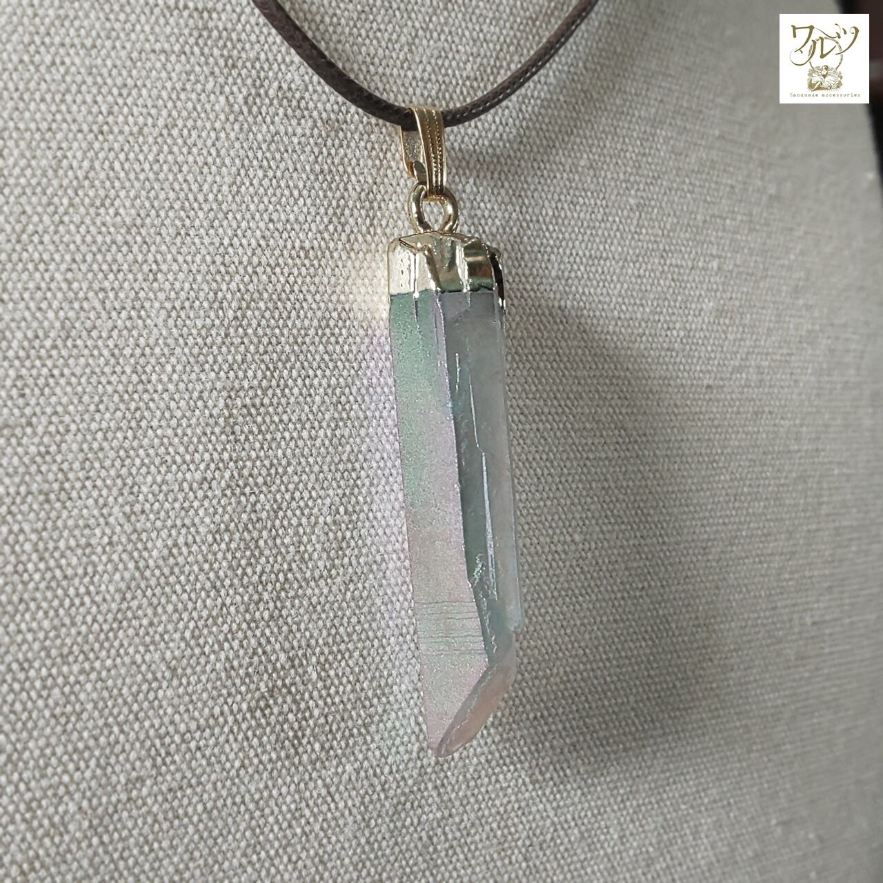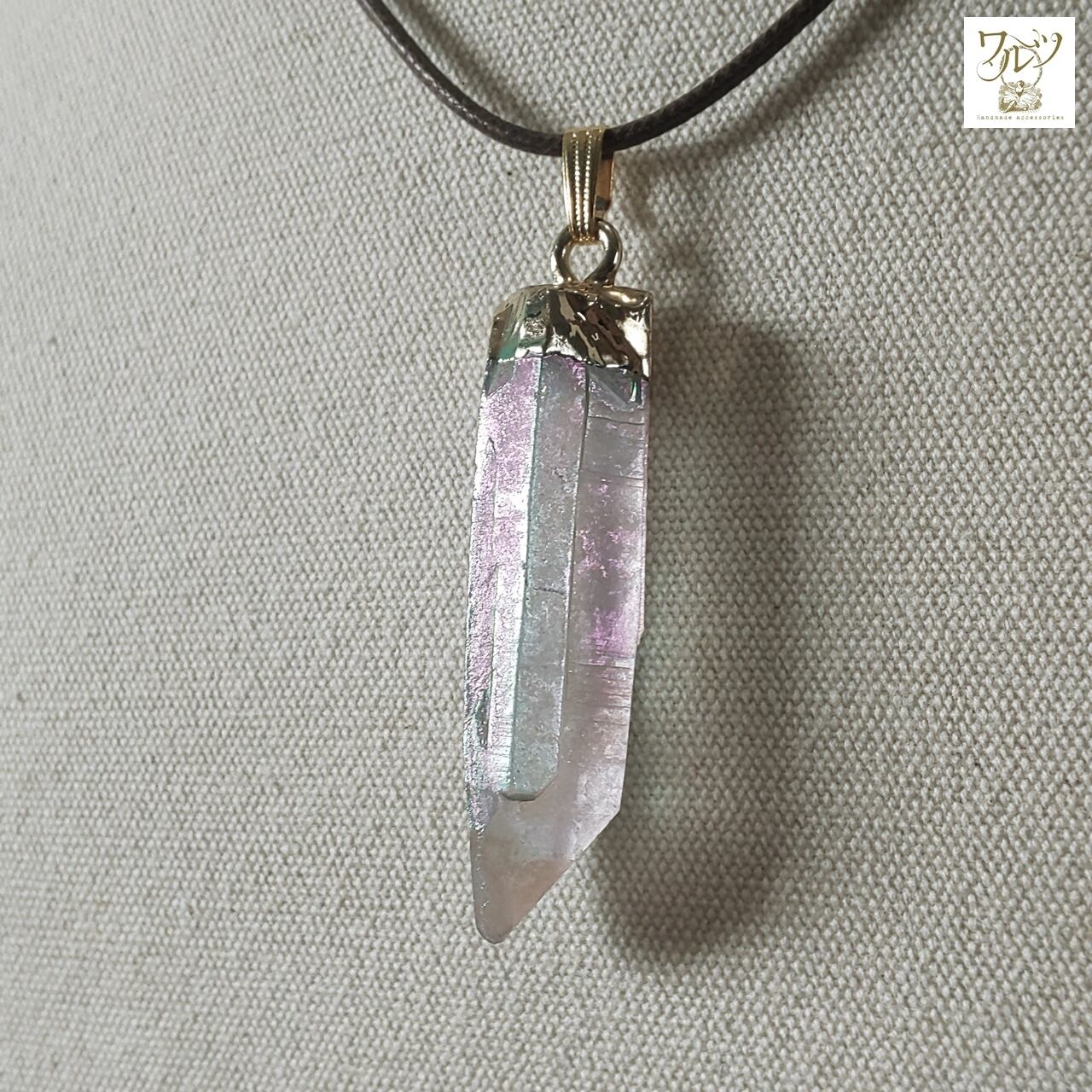 原石の形や表面の風合いが生かされた、オーロラ色の水晶のネックレス。