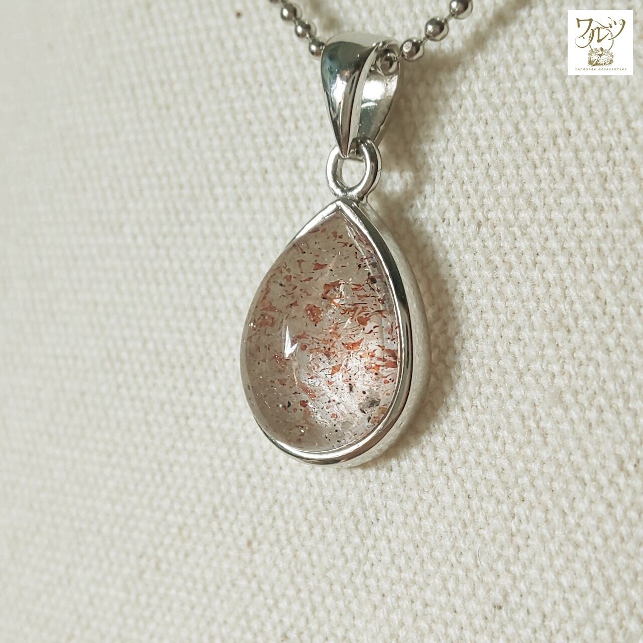 火花やラメのように見える赤褐色のレピドクロサイトを内包した水晶のネックレス。