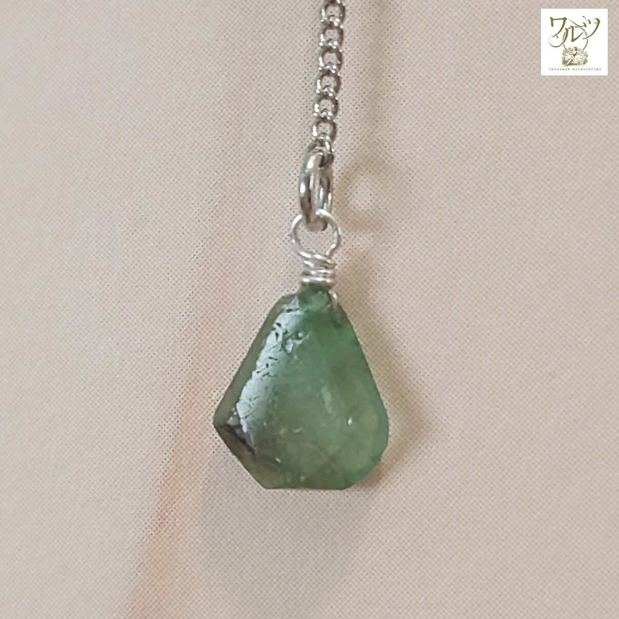 不規則な形にカットされた半透明グリーンのエメラルドのアクセサリー。