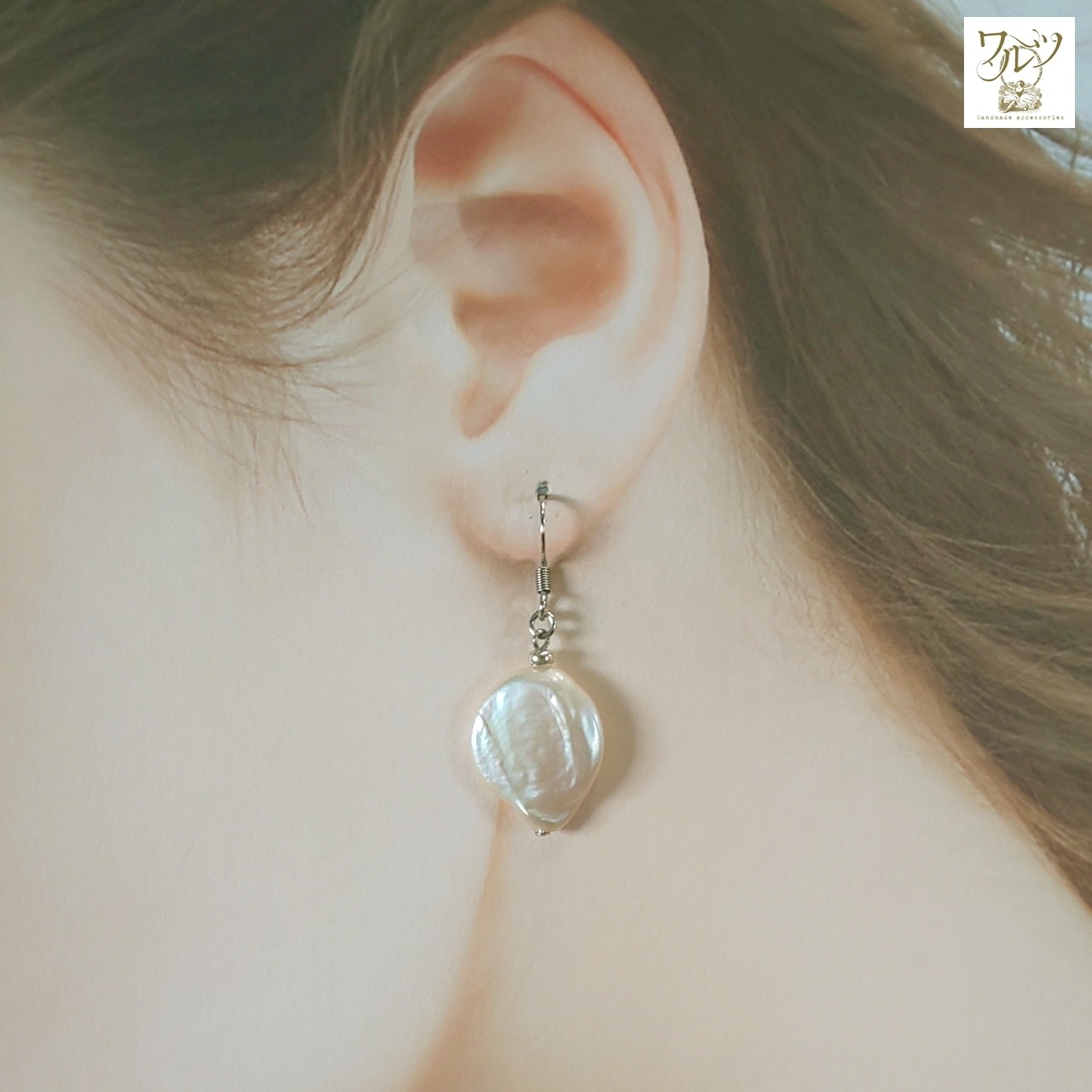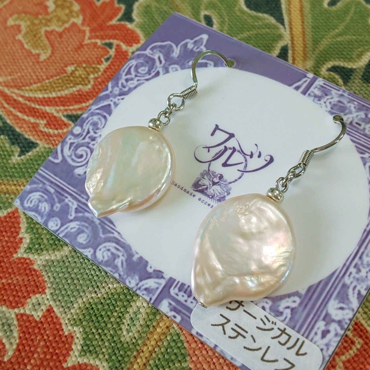 硬貨やおはじきのような平たい淡水パールのアクセサリー。
