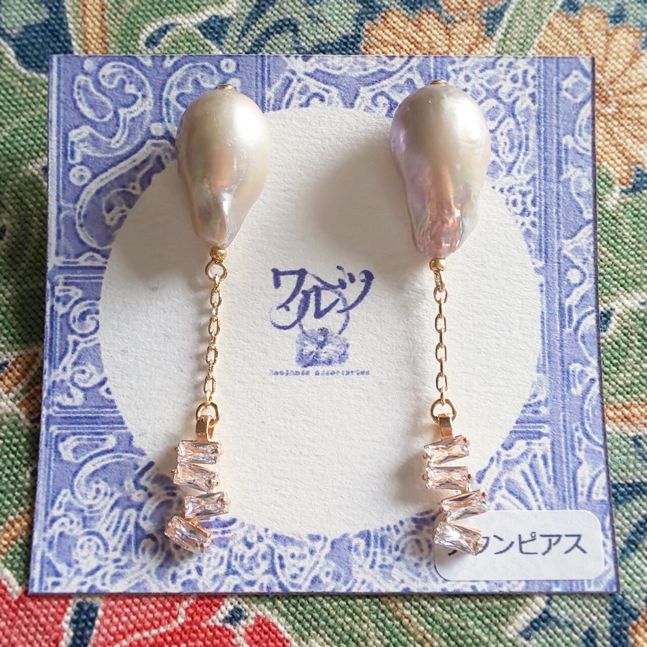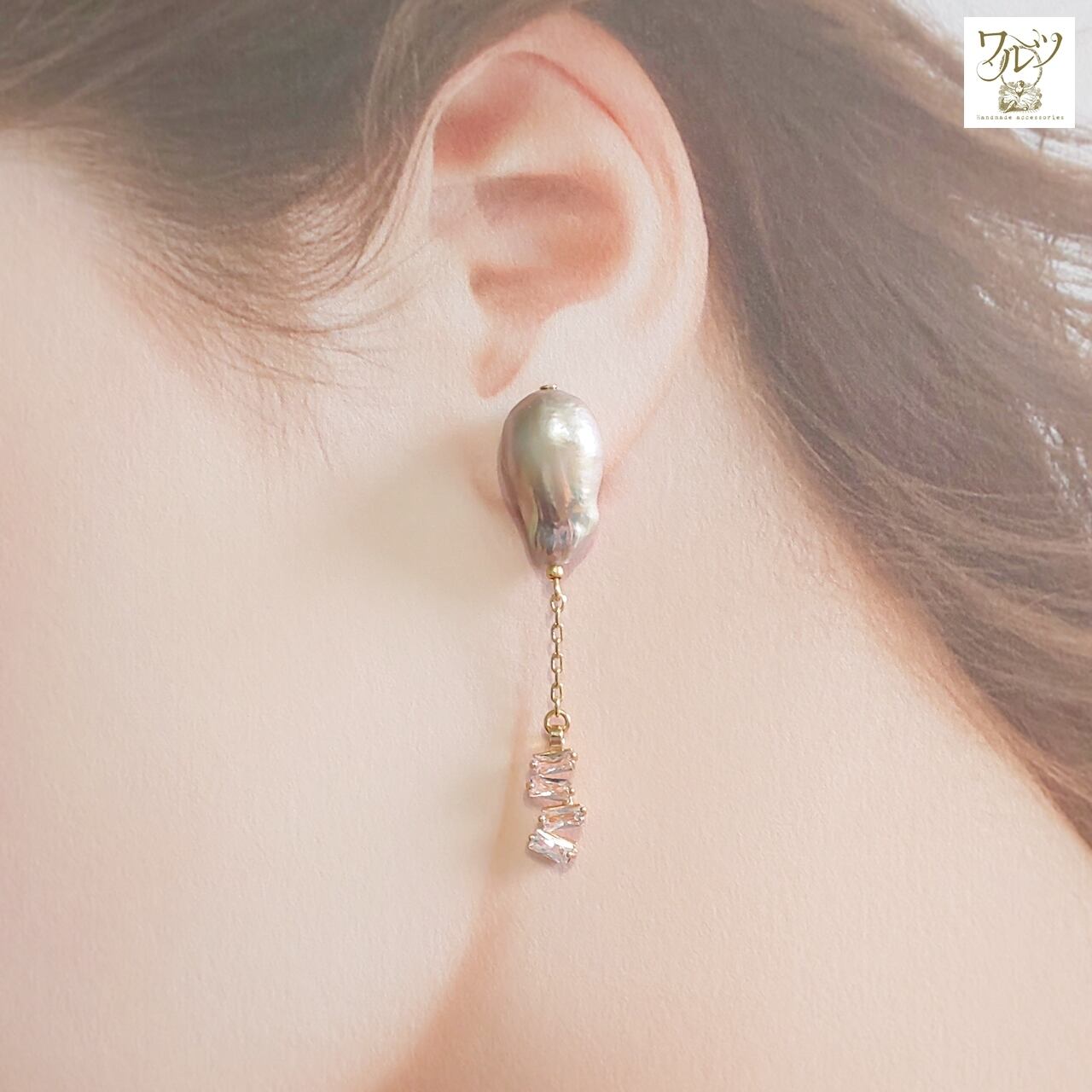 ベージュがかったグレーの淡水パールと、キラキラのキュービックジルコニアを合わせたイヤリング。