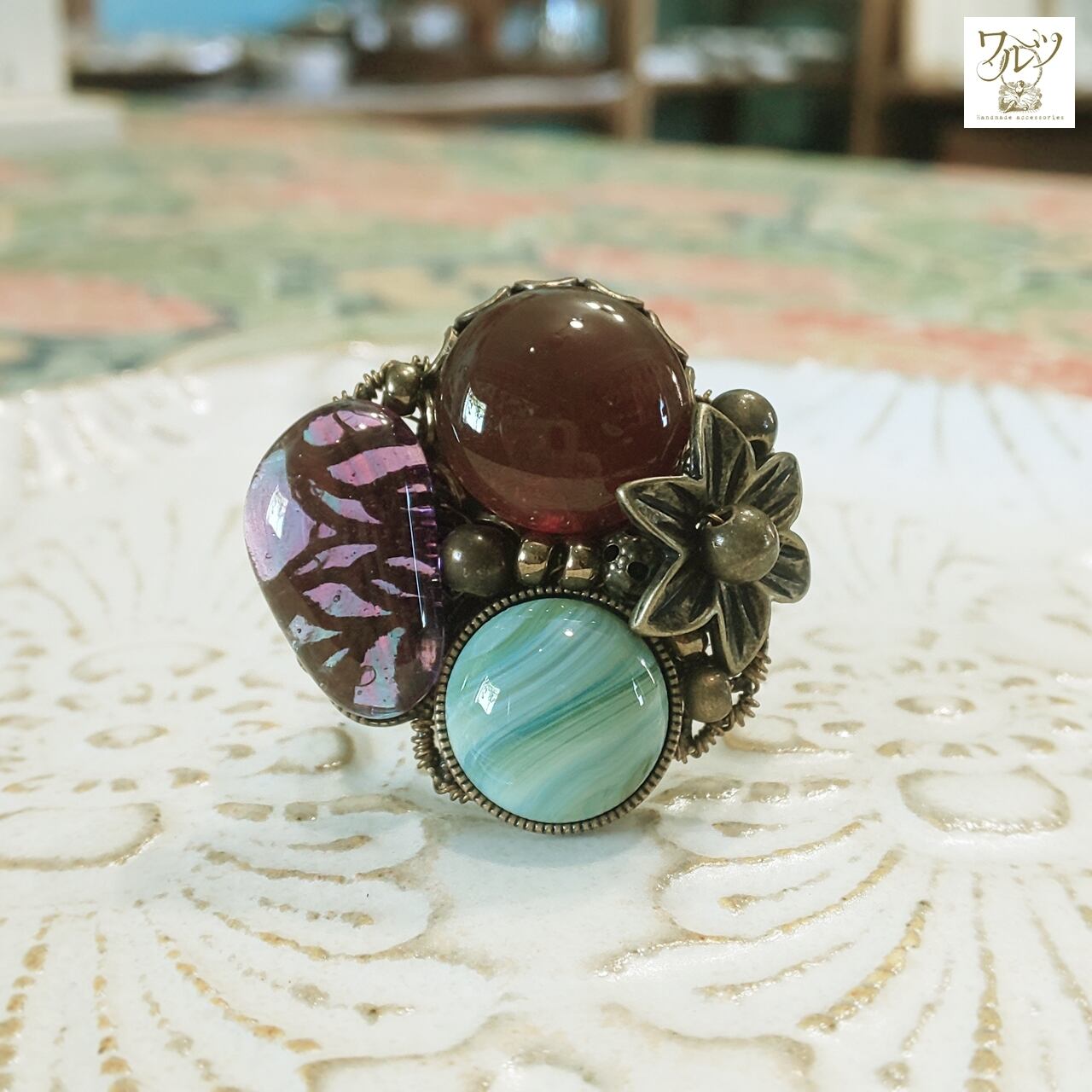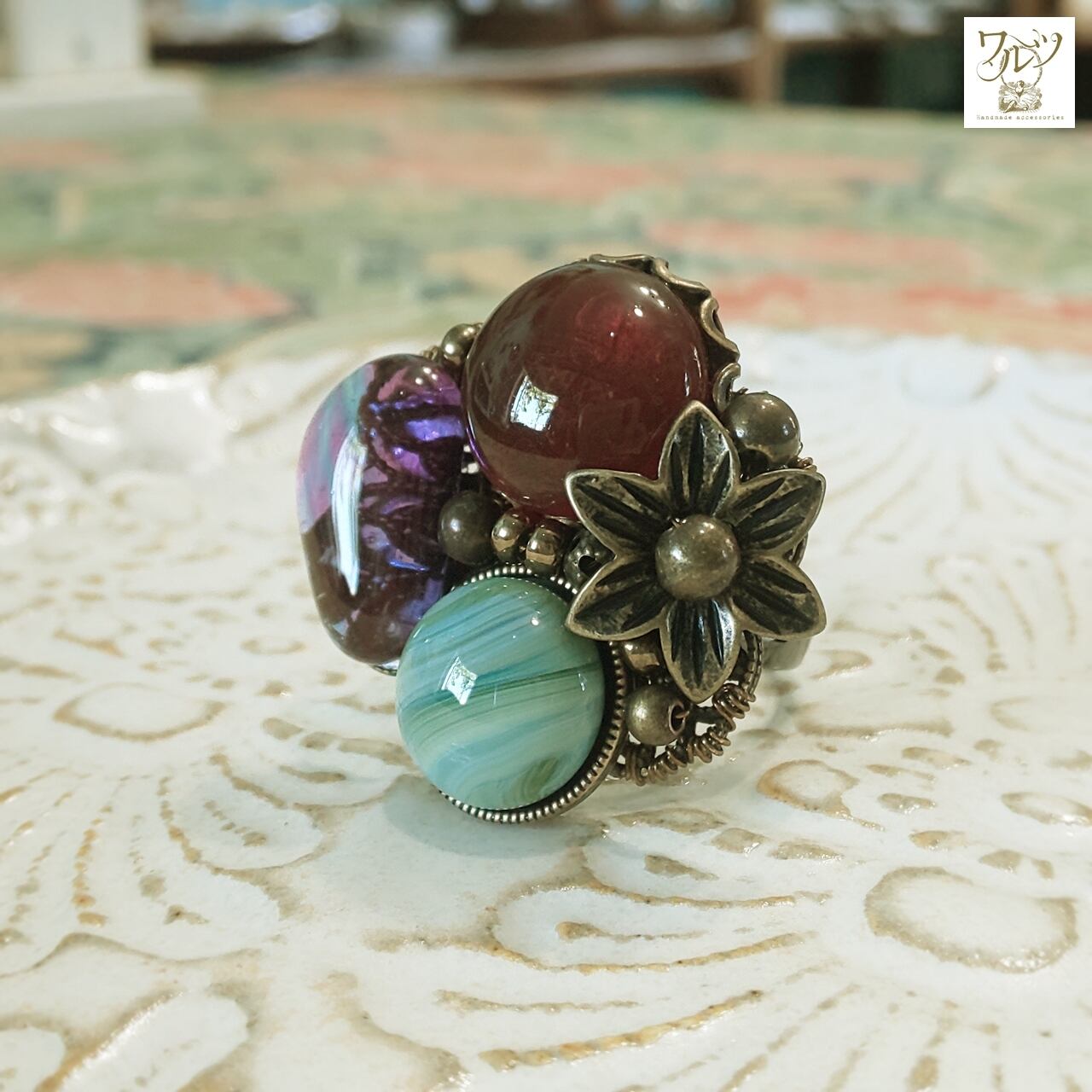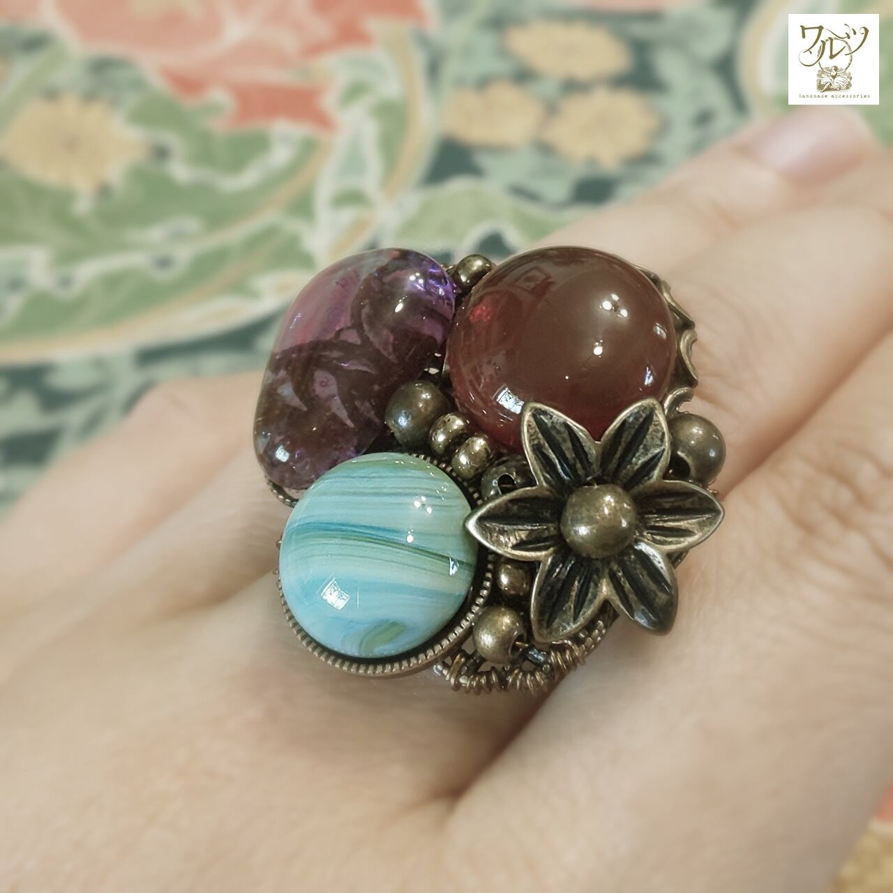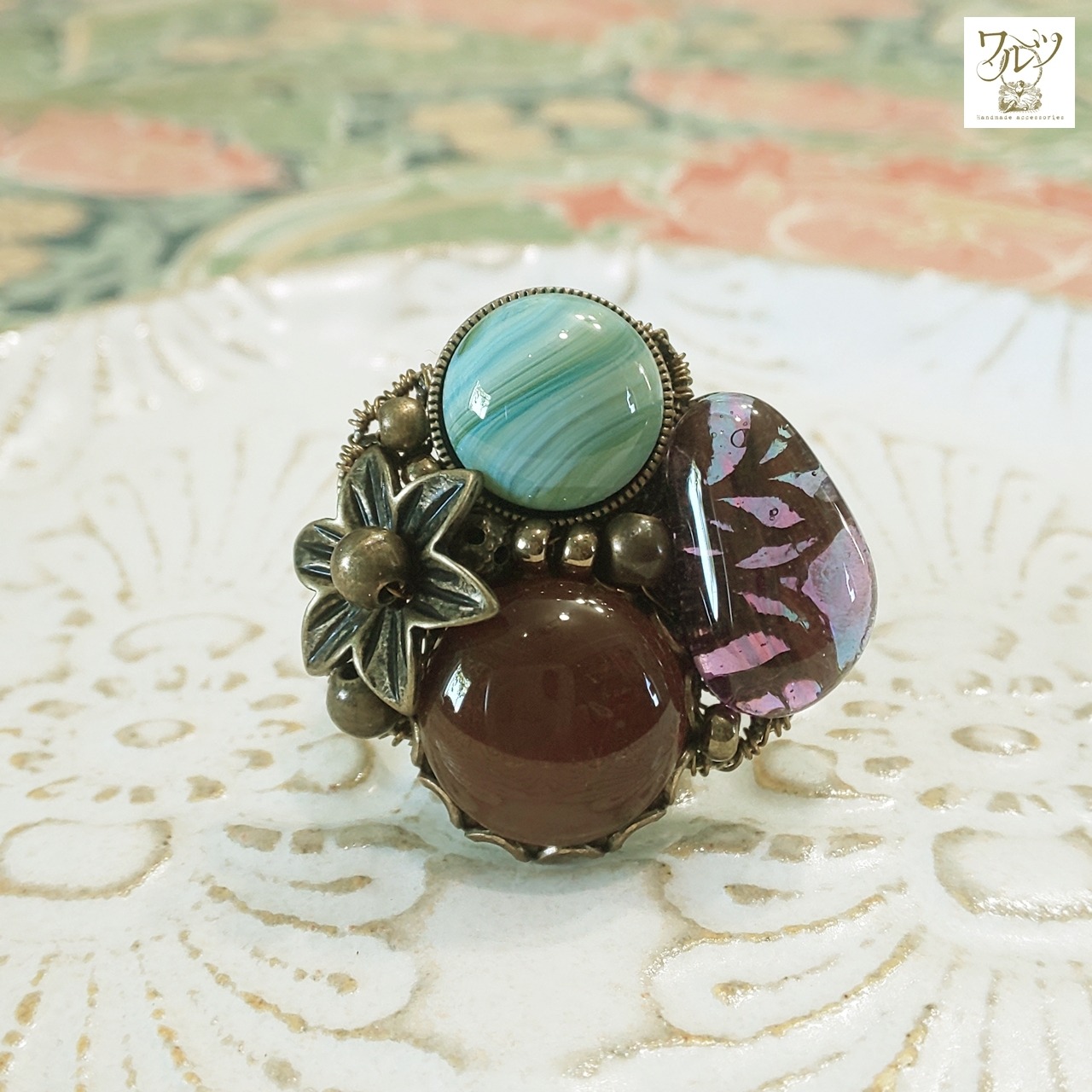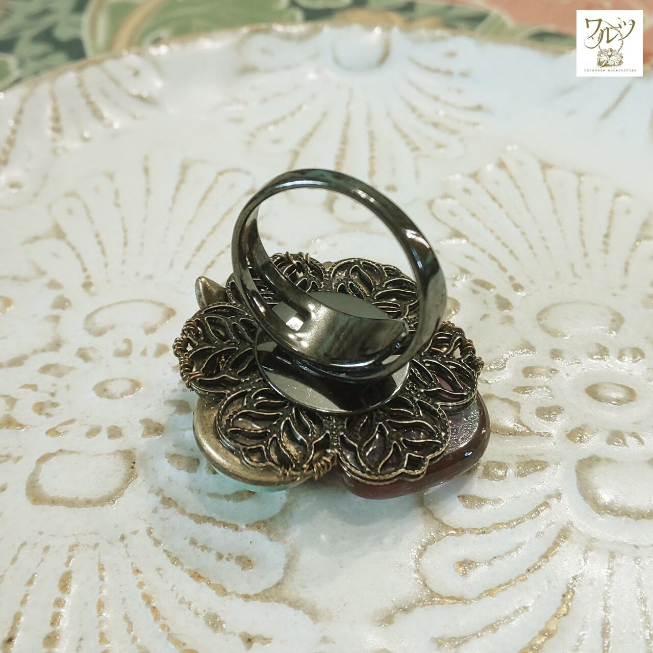 全体的な金具の色は金古美(ブラウン)で、指輪パーツは黒です。