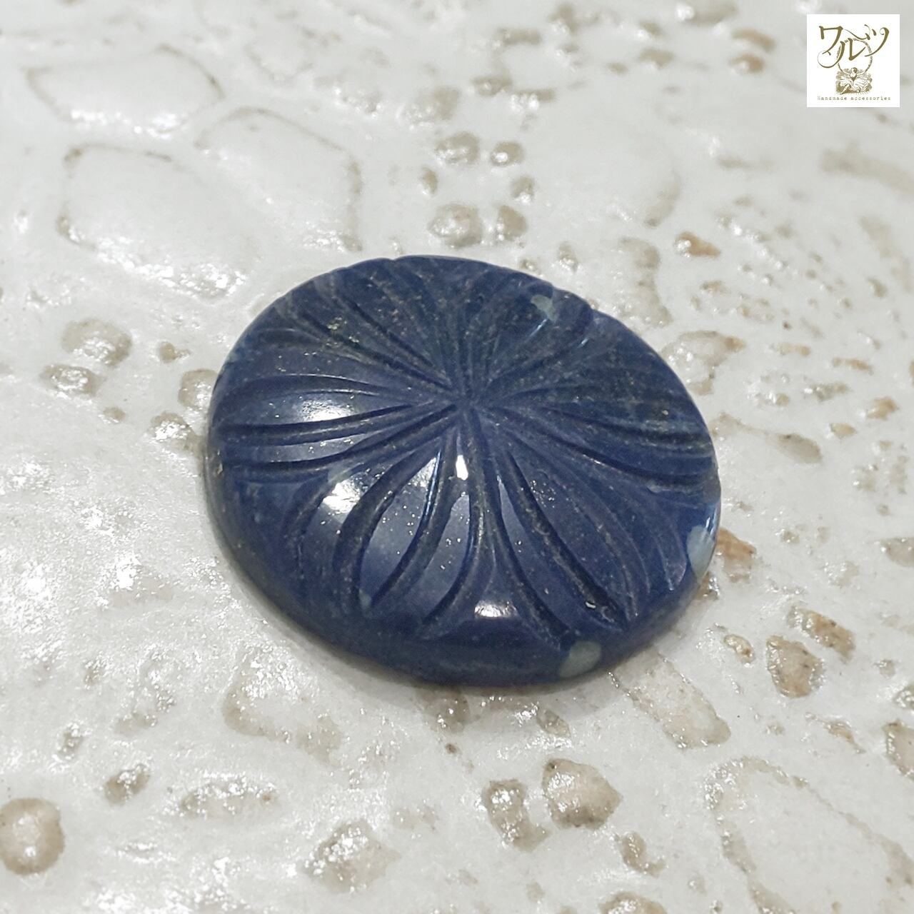 落ち着いた青色に、パイライトの銀やカルサイトの灰や白色の模様が混じったアフガニスタン産ラピスラズリのカボション。