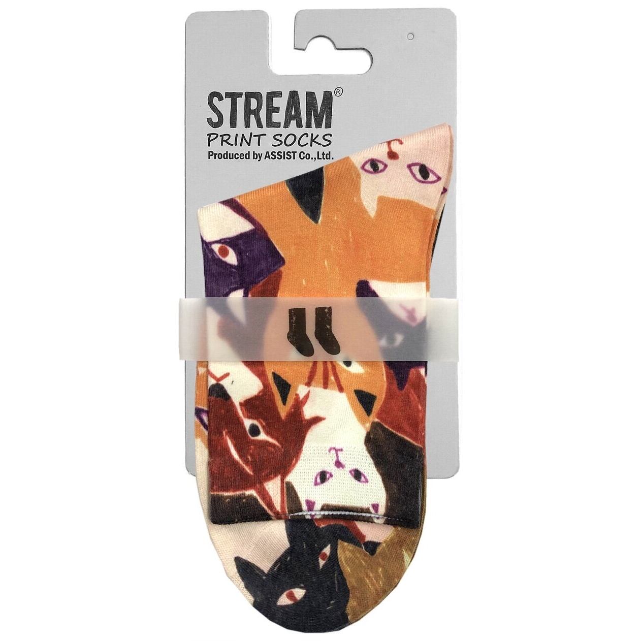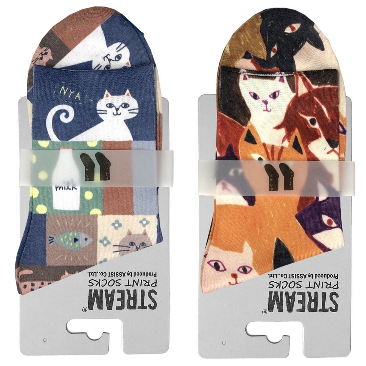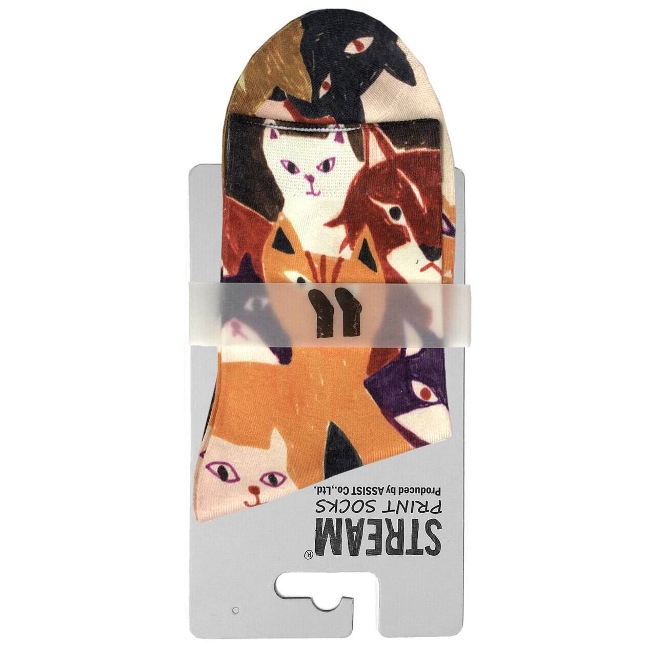 ブランド STREAM 婦人みつめる猫達プリントクルーソックス