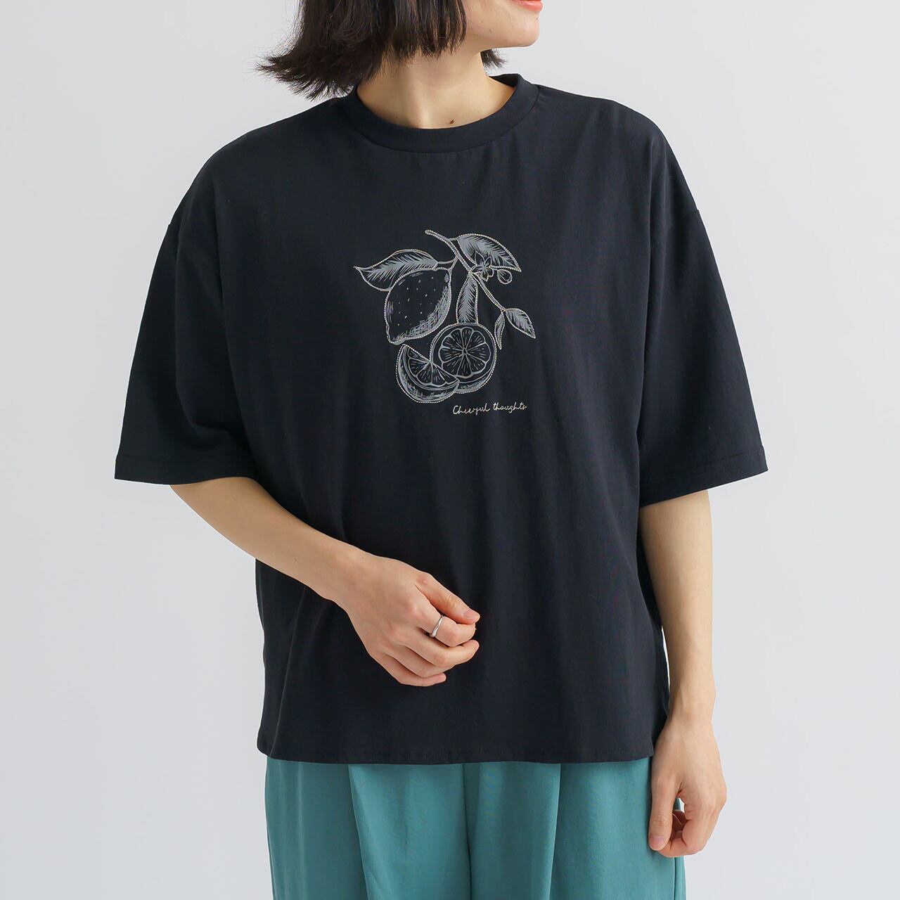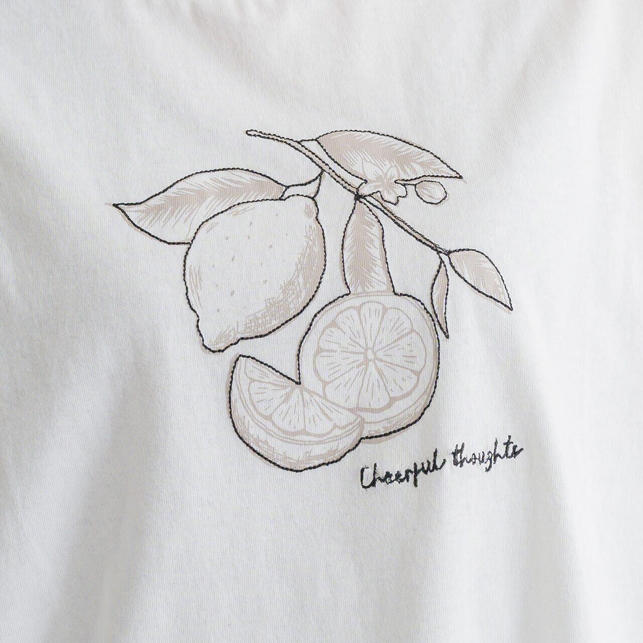 手描ききのレモンプリント+刺繍ステッチが目を惹くTシャツ。